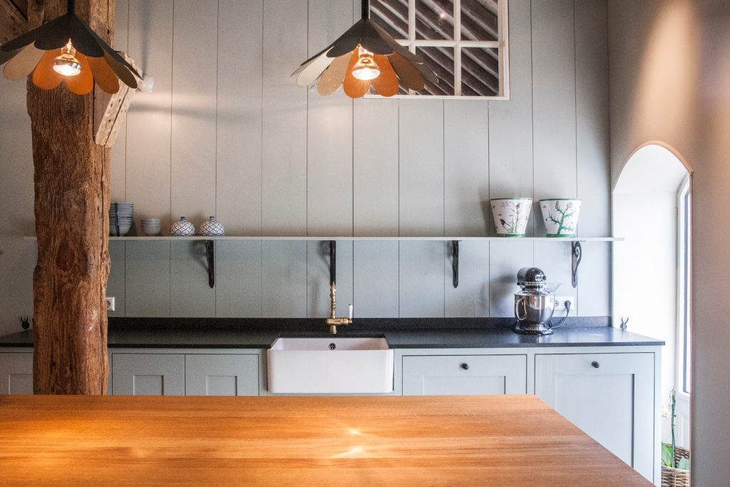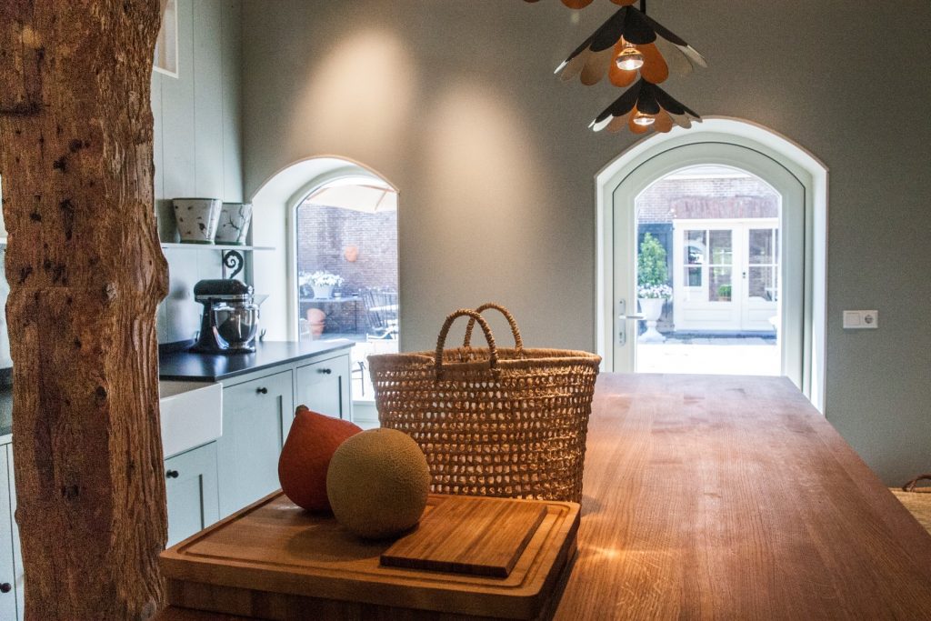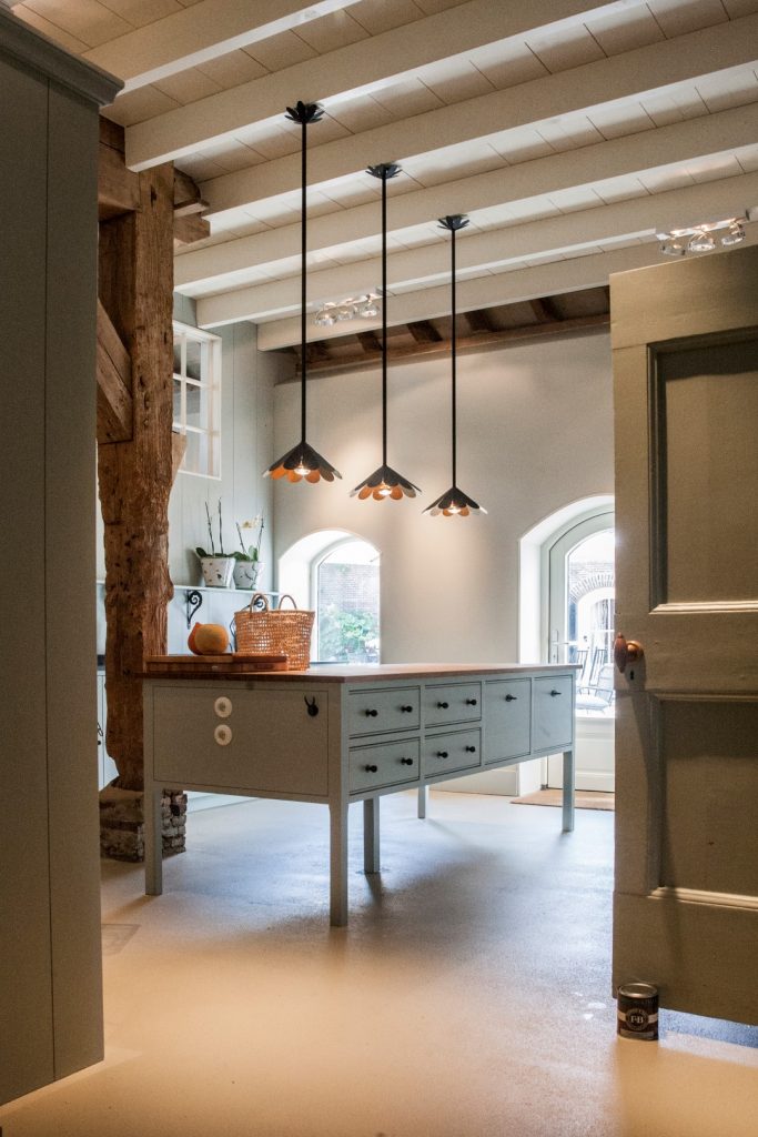 De nieuwe keukenruimte is gecreëerd in de voormalige “deel” van de boerderij – voorheen een grote, open schuur. Een markante eikenhouten staander, onderdeel van de oorspronkelijke dakconstructie, vormde een vaste waarde in de ruimte en een element waar wij in het ontwerp omheen moesten denken. Wat in eerste instantie een beperking leek, groeide uit tot een bepalend en bijna sculpturaal onderdeel van het ontwerp.