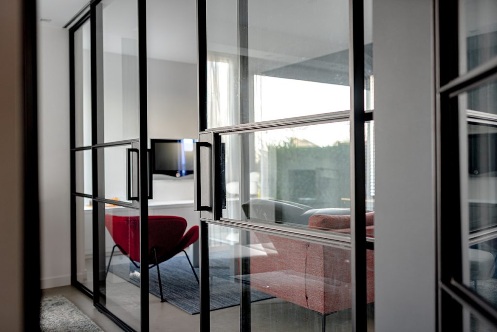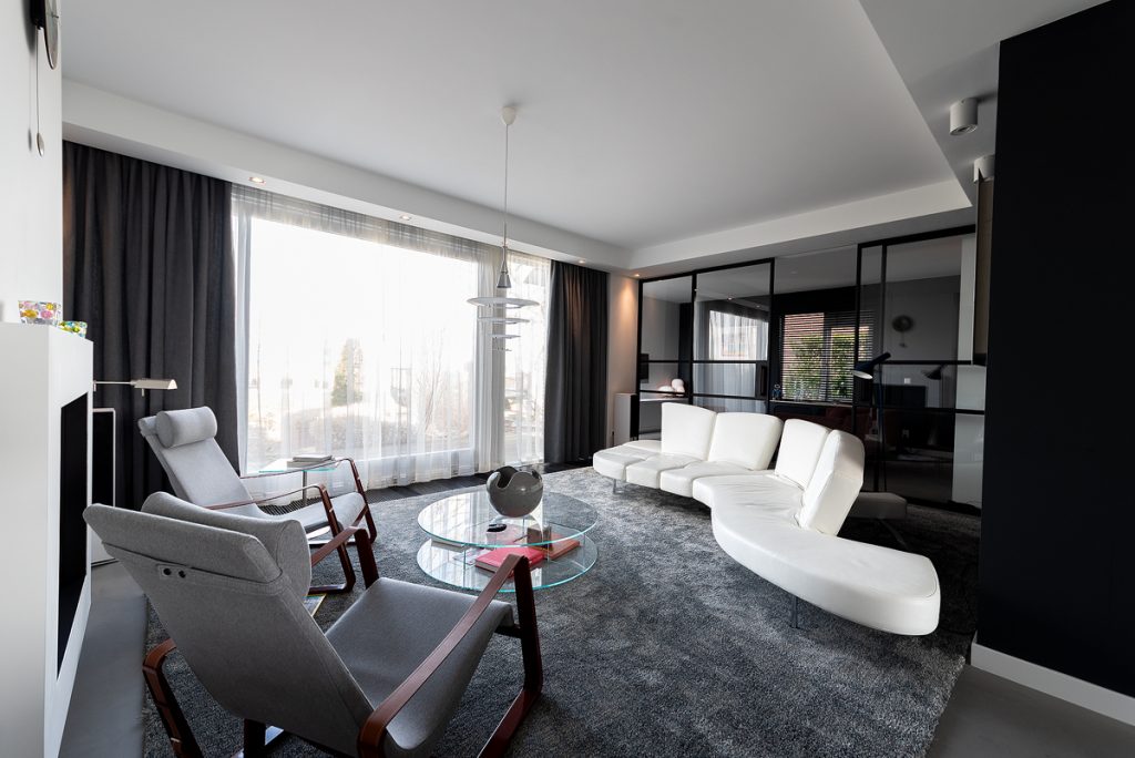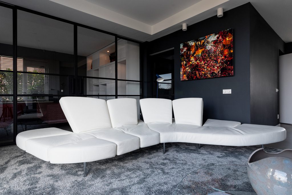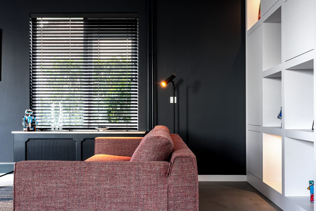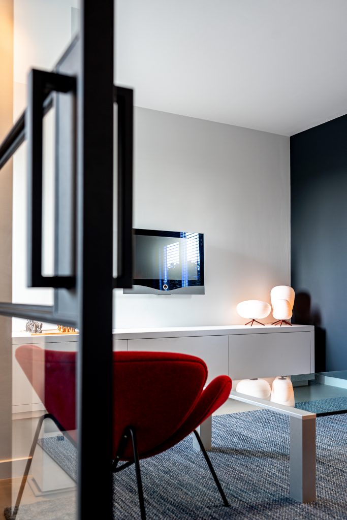 De achterkamer is ingericht als tv-ruimte. Om deze subtiel van de zitkamer te scheiden, is een transparante metalen schuifwand geplaatst die, wanneer gesloten, vergelijkbare geluidsreductie biedt als een gewone deur. Dit maakt het mogelijk dat een deel van het gezin tv kan kijken terwijl de rest elders verblijft zonder het gevoel van verbondenheid te verliezen. Alle materialen, meubelen, stoffen, raamdecoraties en verlichtingsarmaturen zijn zorgvuldig op elkaar afgestemd, waardoor de ruimtes harmonieus samenkomen en een gevoel van balans en samenhang ontstaat.