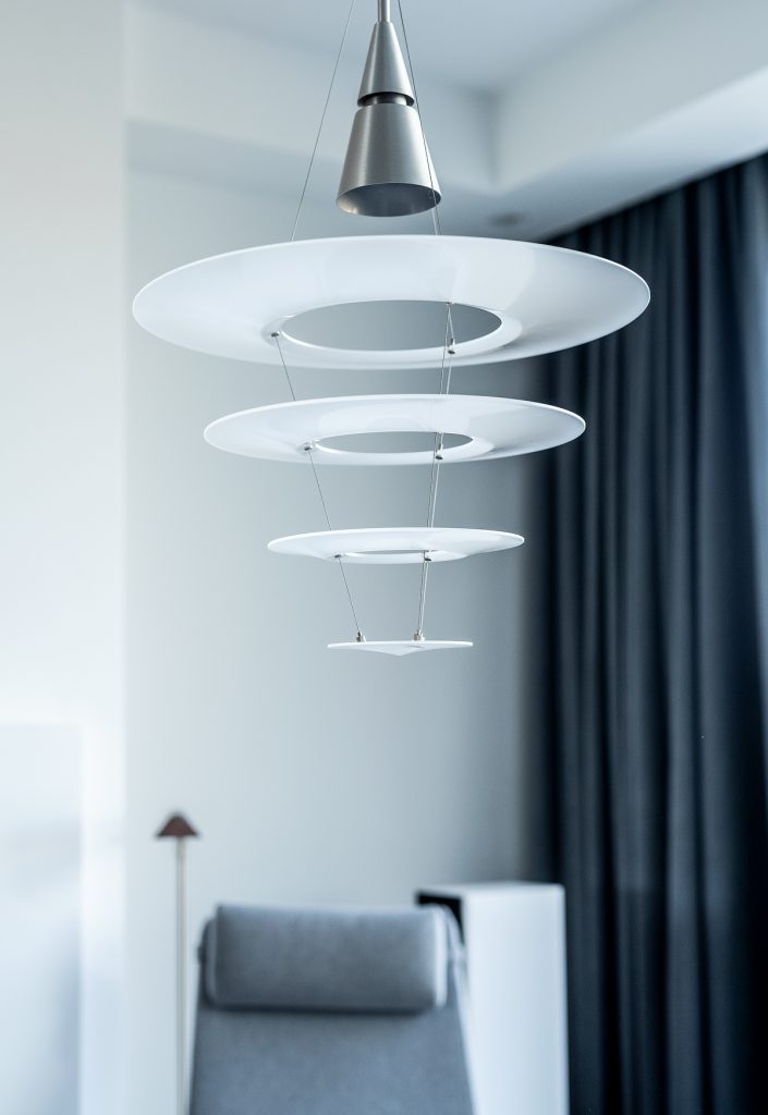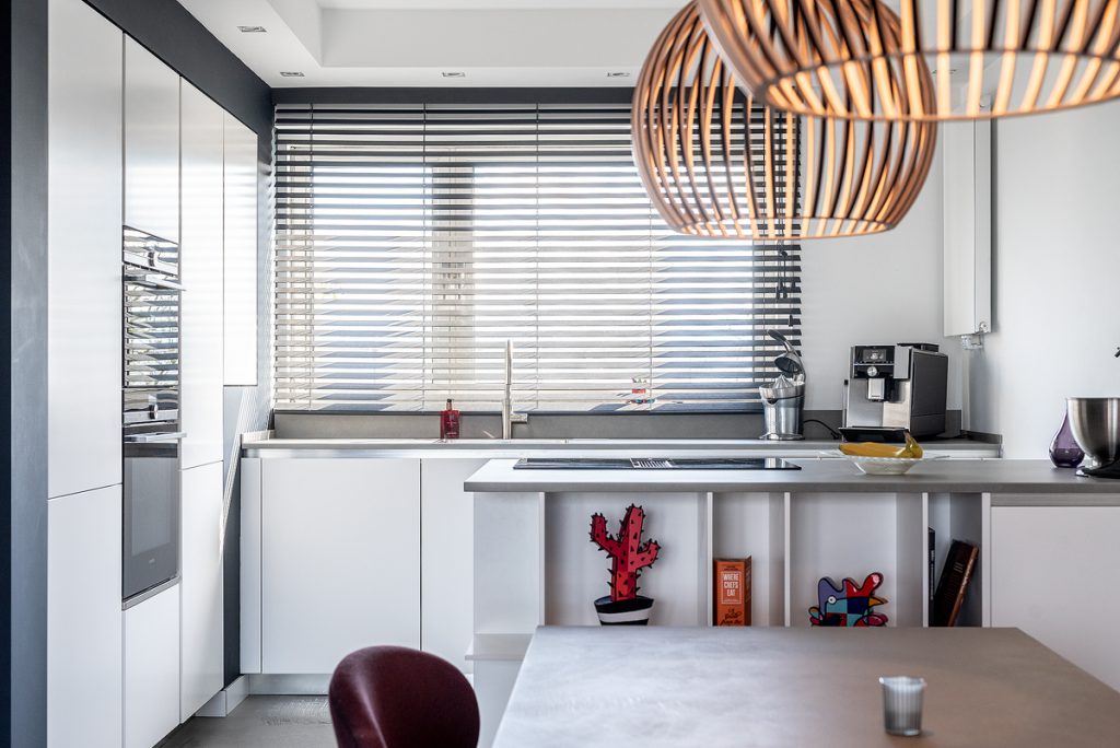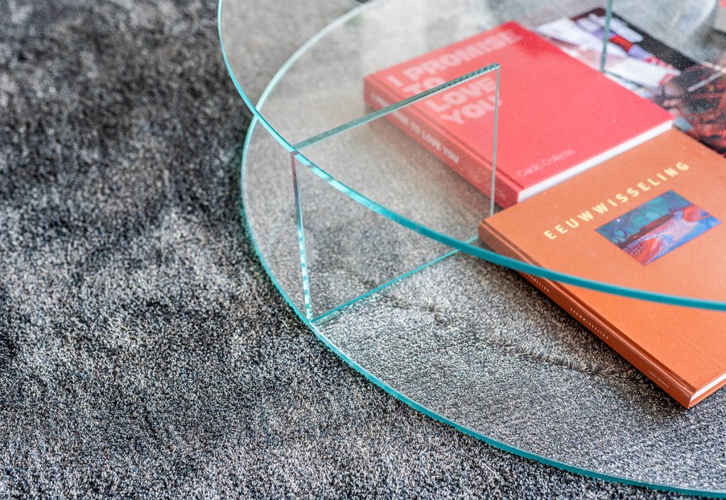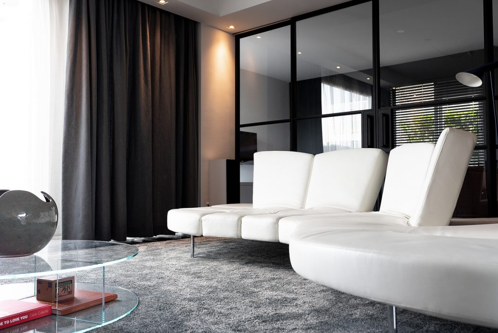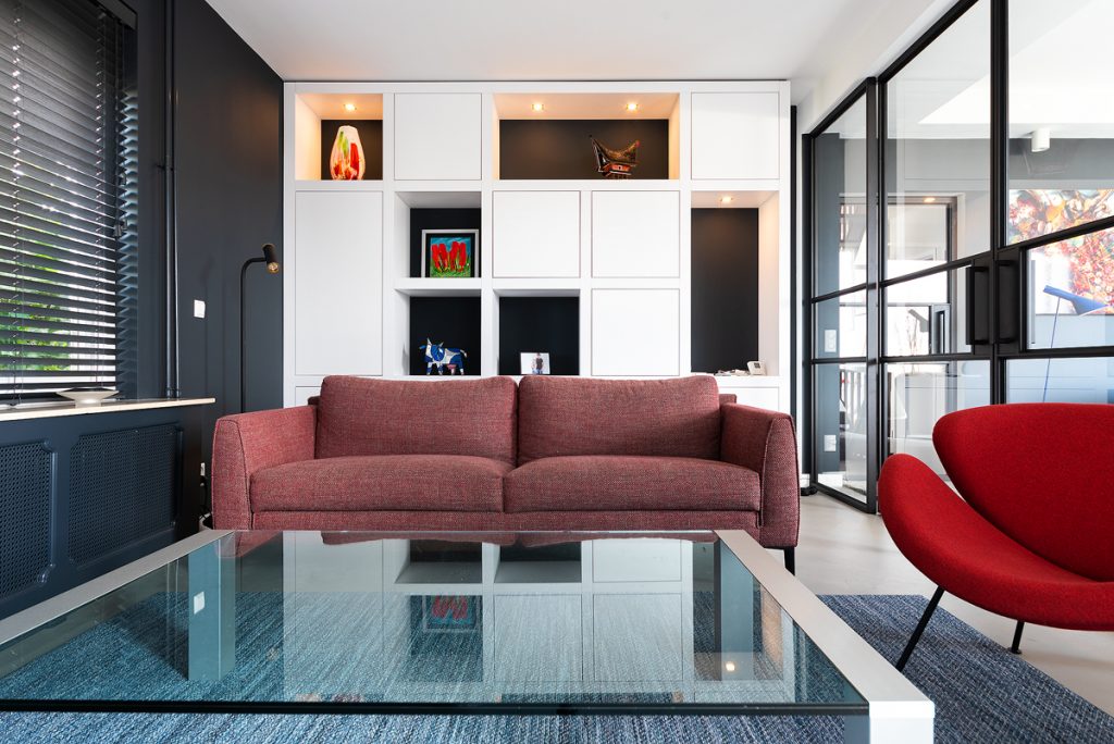 De achterkamer is ingericht als tv-ruimte. Om deze subtiel van de zitkamer te scheiden, is een transparante metalen schuifwand geplaatst die, wanneer gesloten, vergelijkbare geluidsreductie biedt als een gewone deur. Dit maakt het mogelijk dat een deel van het gezin tv kan kijken terwijl de rest elders verblijft zonder het gevoel van verbondenheid te verliezen. Alle materialen, meubelen, stoffen, raamdecoraties en verlichtingsarmaturen zijn zorgvuldig op elkaar afgestemd, waardoor de ruimtes harmonieus samenkomen en een gevoel van balans en samenhang ontstaat.