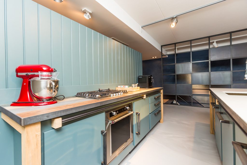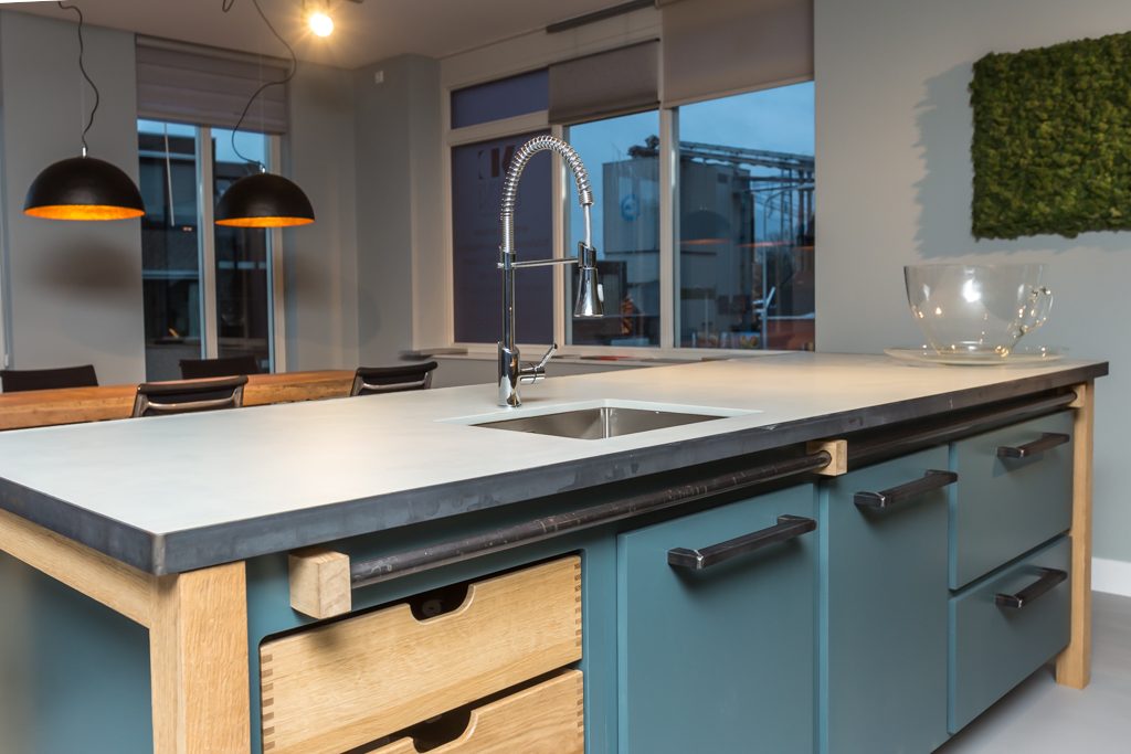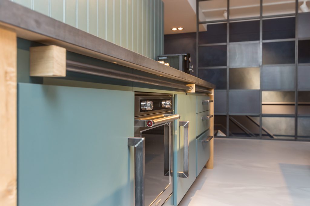 Aan de voorzijde plaatsten we een royale, op maat gemaakte werktafel van massief eiken. De steunen onder het blad zijn afkomstig van een oude treinbuffer—een stoer, uniek detail dat het verhaal van de ruimte versterkt. De keuken, geleverd door Engelse Keukens, sluit hier naadloos op aan, praktisch én stijlvol.