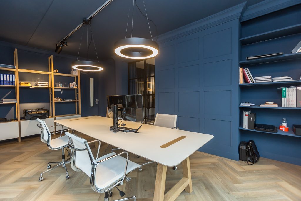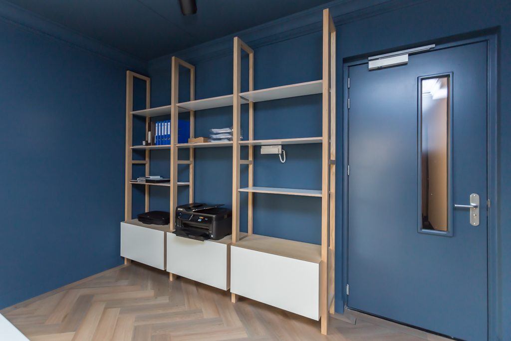 De gehele studio is geschilderd in een diepe blauwtint, inclusief het plafond. Deze keuze brengt rust in de overvloed aan daglicht en tilt de eiken PVC-vloer visueel omhoog, waardoor de ruimte warmte en verfijning krijgt.
