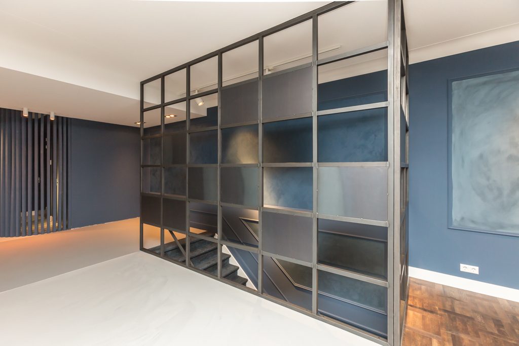 Stalen deuren verbinden het kantoor met de aangrenzende ruimtes en zorgen voor een open, luchtige sfeer. De werktafel en het wandmeubel—beiden ontworpen door Straight Interior Design—dragen bij aan een prettige en functionele werkdag.